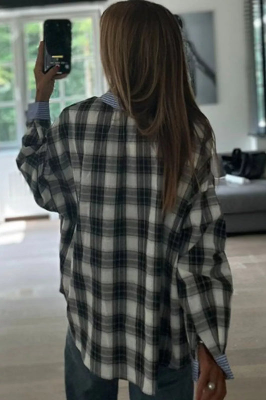 Contrast Striped Edge Half Placket Plaid Blouse